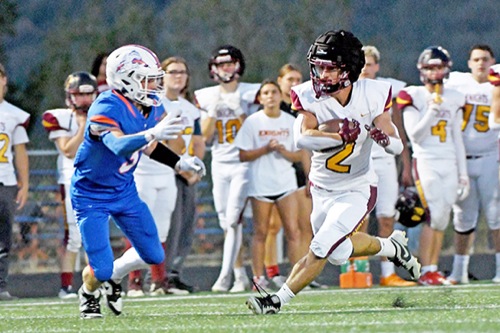 North Valley's Hayden Taylor (right) tries to shake Hidden Valley's Lawson O'Leary (left) as he picks up yards in the first quarter on Friday night, Sept. 19, in Murphy.