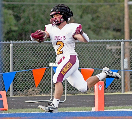 North Valley's Hayden Taylor scores the Knights' first touchdown of their game against Hidden Valley early in the first quarter on Friday night, Sept. 19, in Murphy.