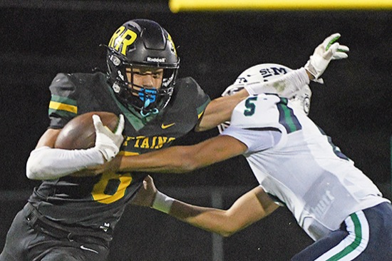 Rogue River's Mason Scott (6) tries to slip past Mason James (5) of St. Mary's after making a reception in the first quarter on Friday night at Chieftain Stadium. The Chieftains defeated the Crusaders 65-42.