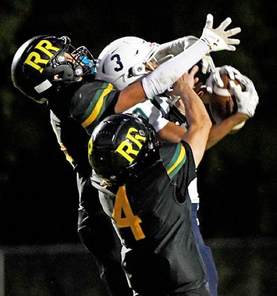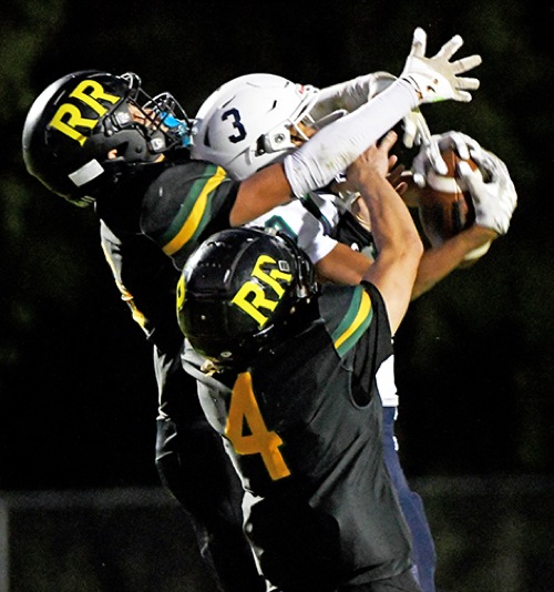 Destyn James (3) of St. Mary's hauls in a reception despite the tight defense of Rogue River's Trevor Dirks (4) and Mason Scott (left) during the first quarter on Friday night at Chieftain Stadium. The Chieftains defeated the Crusaders 65-42.